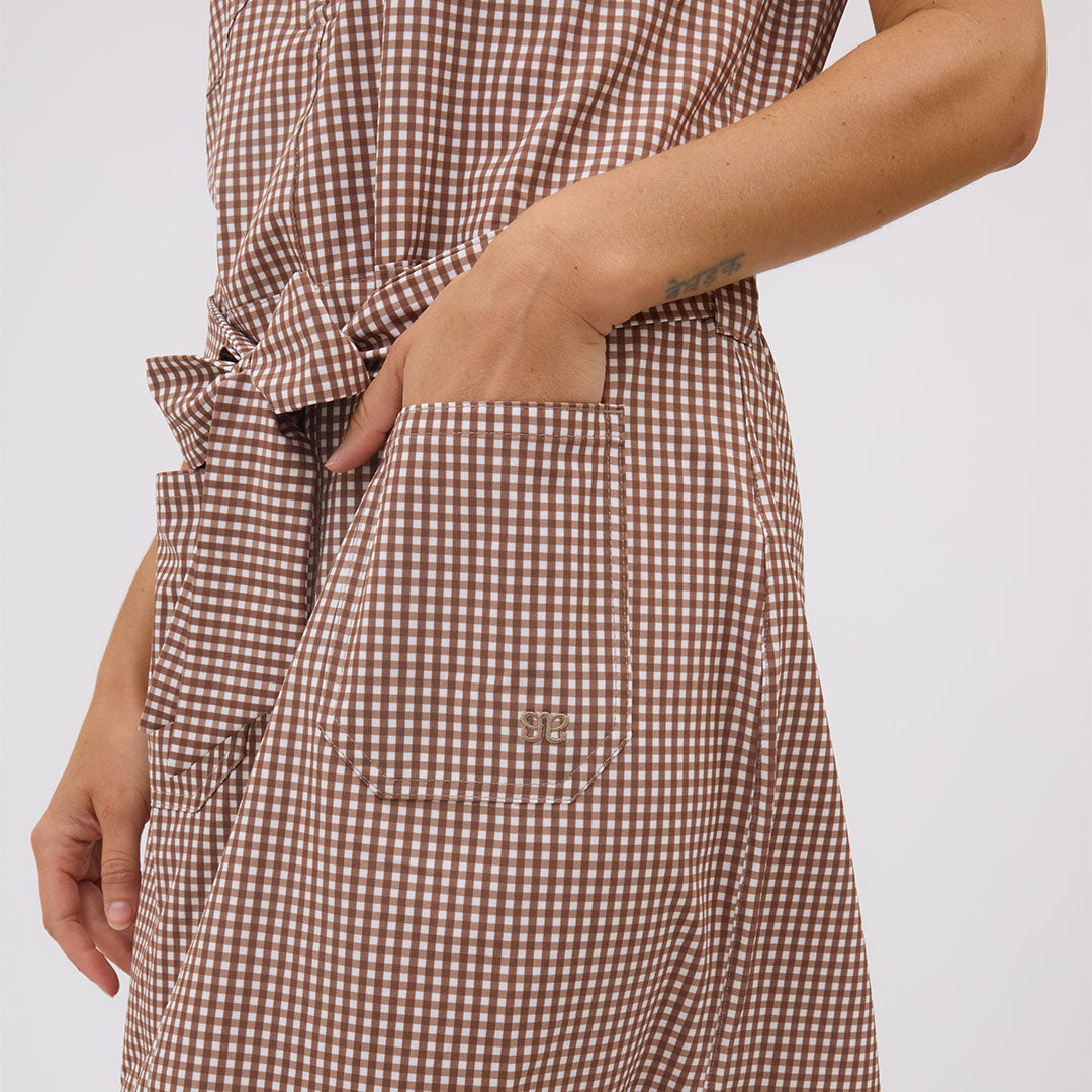 I ordered the large in the vineyard toffee gingham dress. I love the dress, but I am not a fan of wearing belts. Also, I wear petite size. So, I did a small alternation and I can’t love this dress enough! I removed the belt loops, plus the belt, and then I raised the skirt up two inches in the waist since it has a perfect seam to sew on. This made the waist hit the correct place in my body and made the pockets at the right height too.