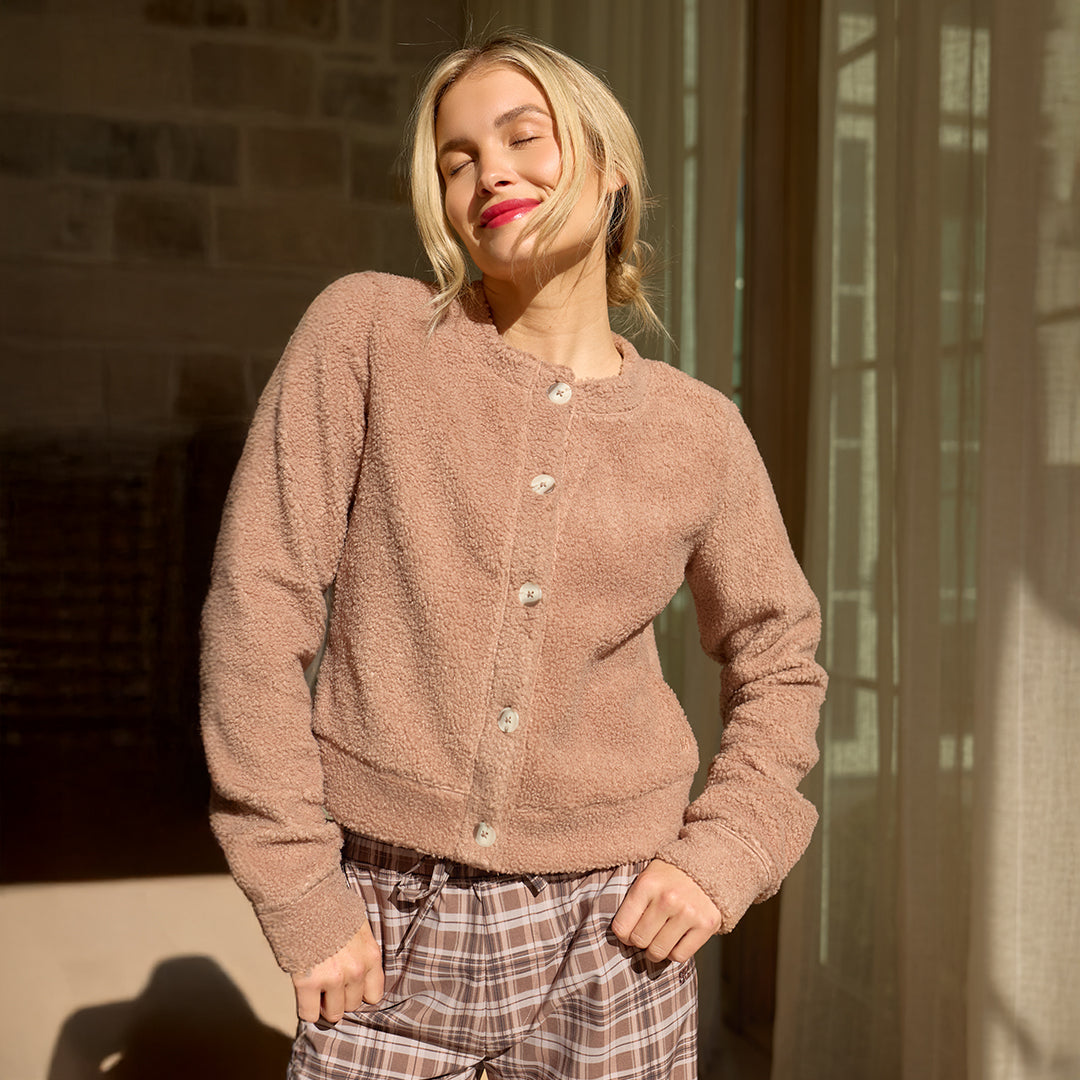 I love the Sherpa cardigan. It is truly the softest fabric, warm without being bulky and soooo cute! I wear it with my Audrey wide leg pants, trousers and also with denim. It is so versatile and easy to style! Love love love! Will be purchasing the black one as well!