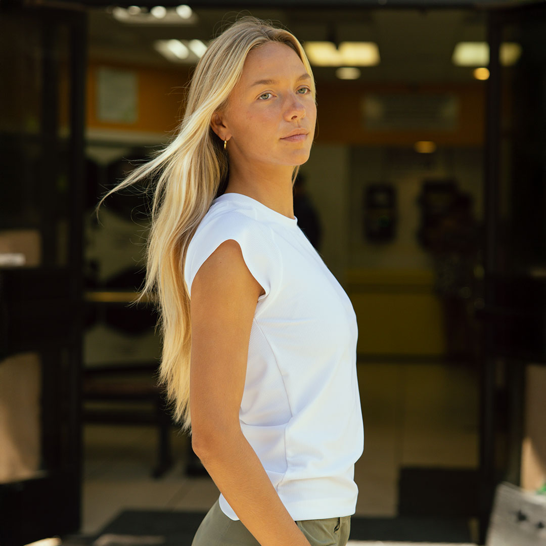 Basic black tee but elevated with a sleek ribbed design. Love wearing with the new windowpane pants for fall. I usually wear a medium in Albion tops. Seems like this top runs a little smaller. Got a large in this one.