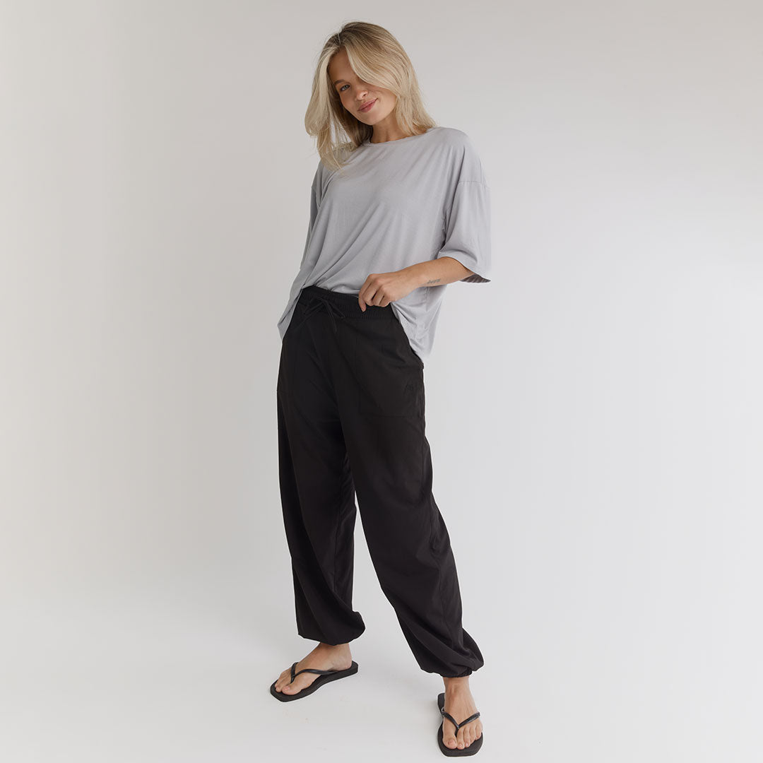 This tee is silky, soft, stretchy, and perfectly oversized. I am 5'6, 135 lbs, and got a size small. I have a long torso and the length was great with high waisted pants. A great closet staple!