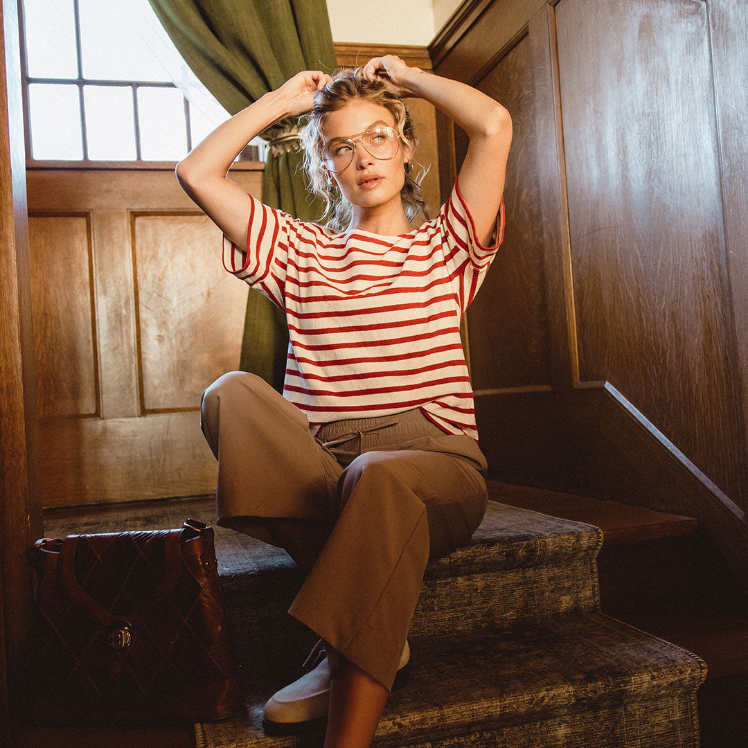 I am enjoying this shirt so much! The material is a heavier weight and I love it. I was a little hesitant to buy it because I had read a review that said the red stripe bled. I have washed mine multiple times now and have not had that problem.