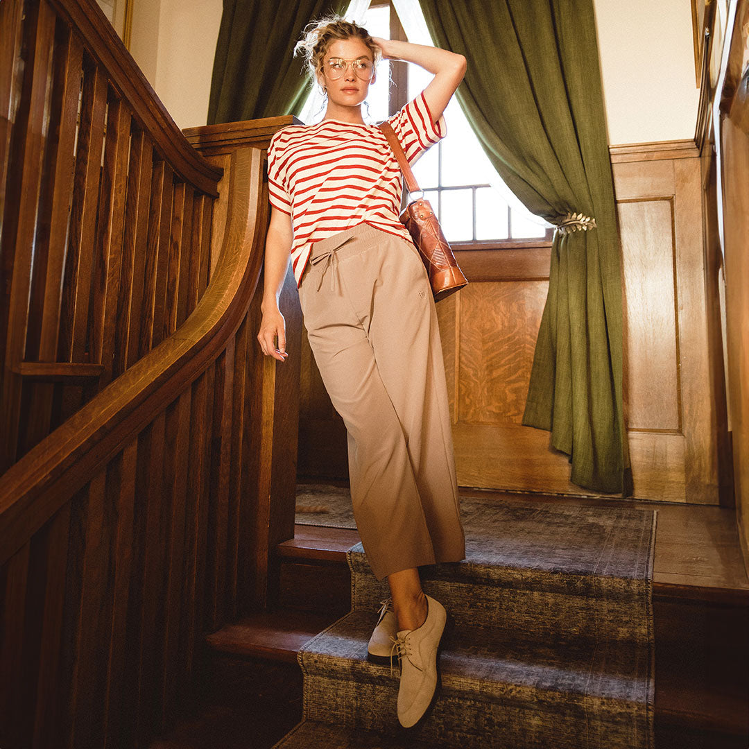 This is a cute shirt. But it runs a little bigger than the same shirt in different material. It can be dressed up or down. The red is not exactly the same as in the stock photo. It is cute and comfortable though.