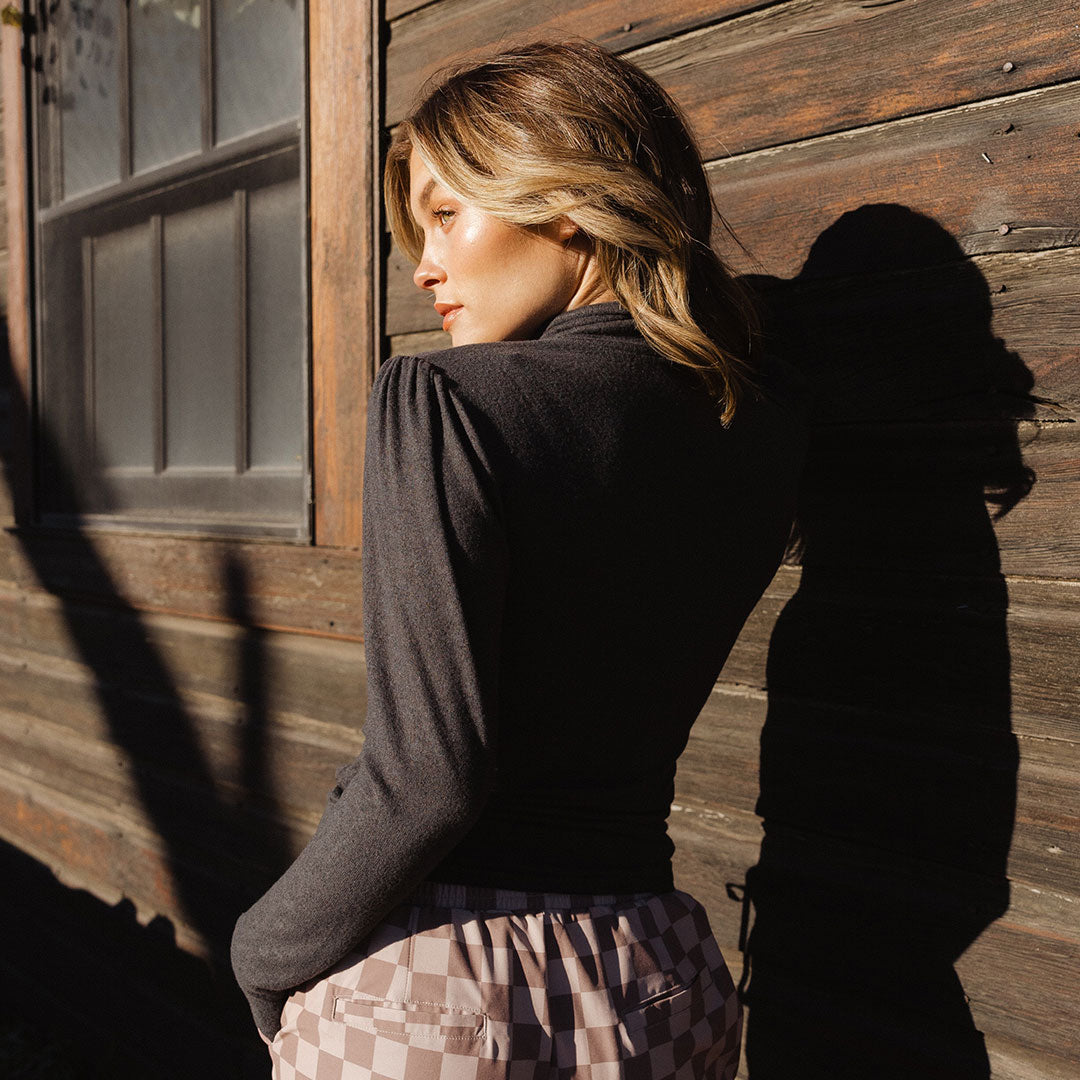 I love the small detailing in the shoulders and subtle turtle neck. Great office piece.