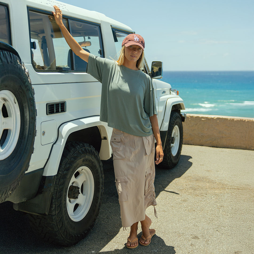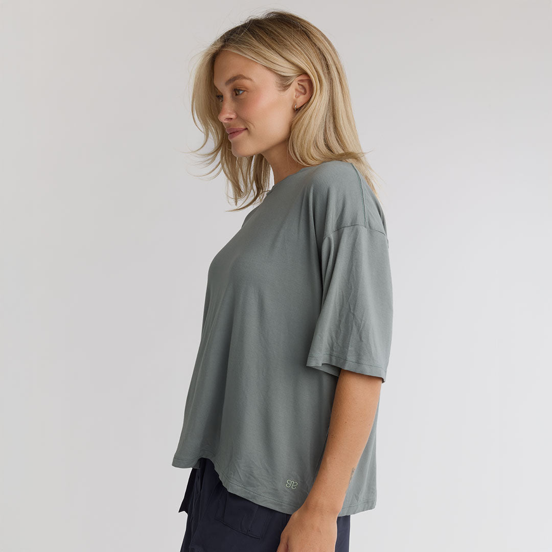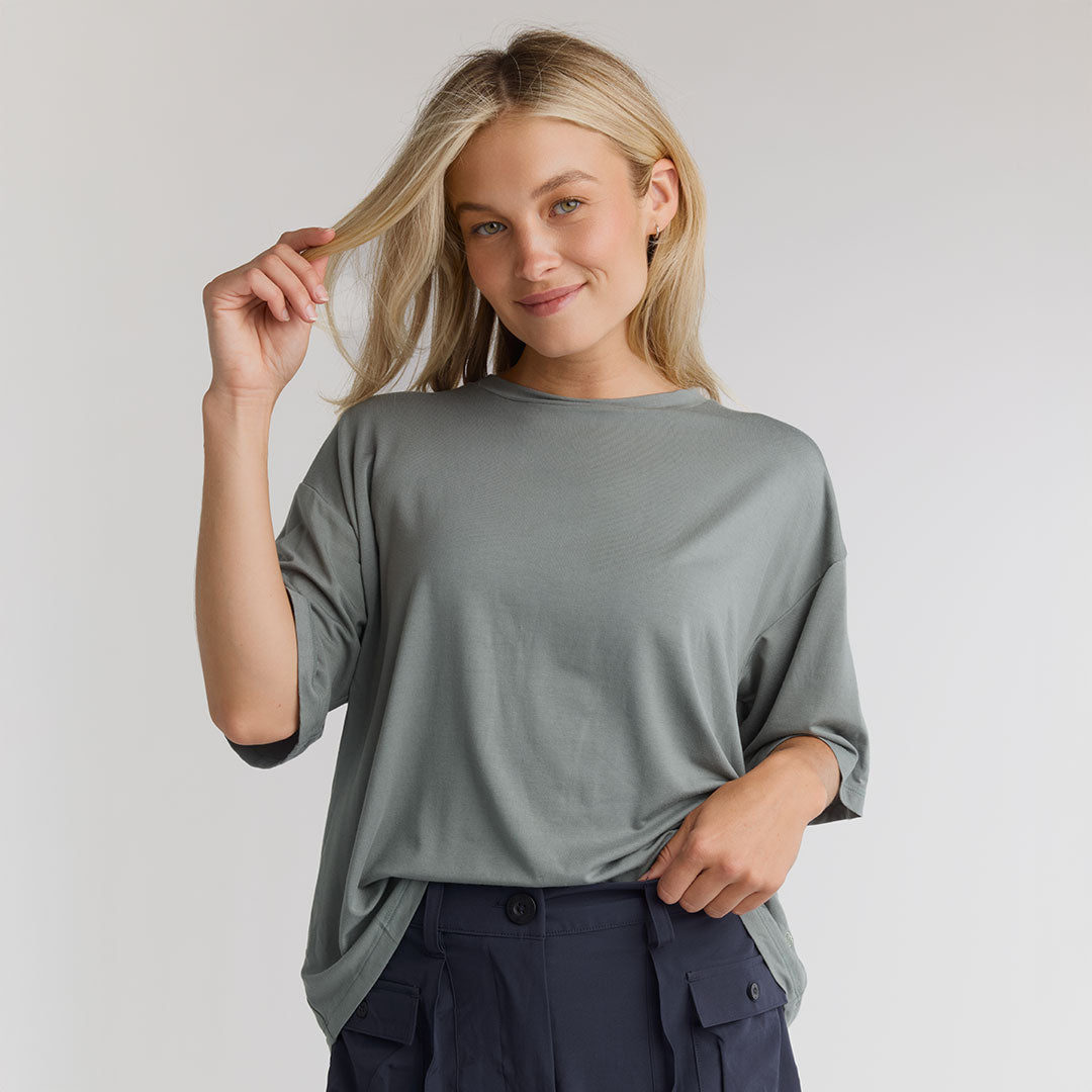 This tee is silky, soft, stretchy, and perfectly oversized. I am 5'6, 135 lbs, and got a size small. I have a long torso and the length was great with high waisted pants. A great closet staple!