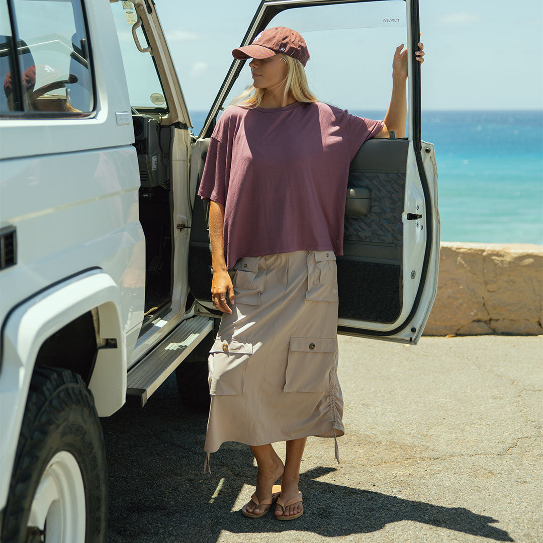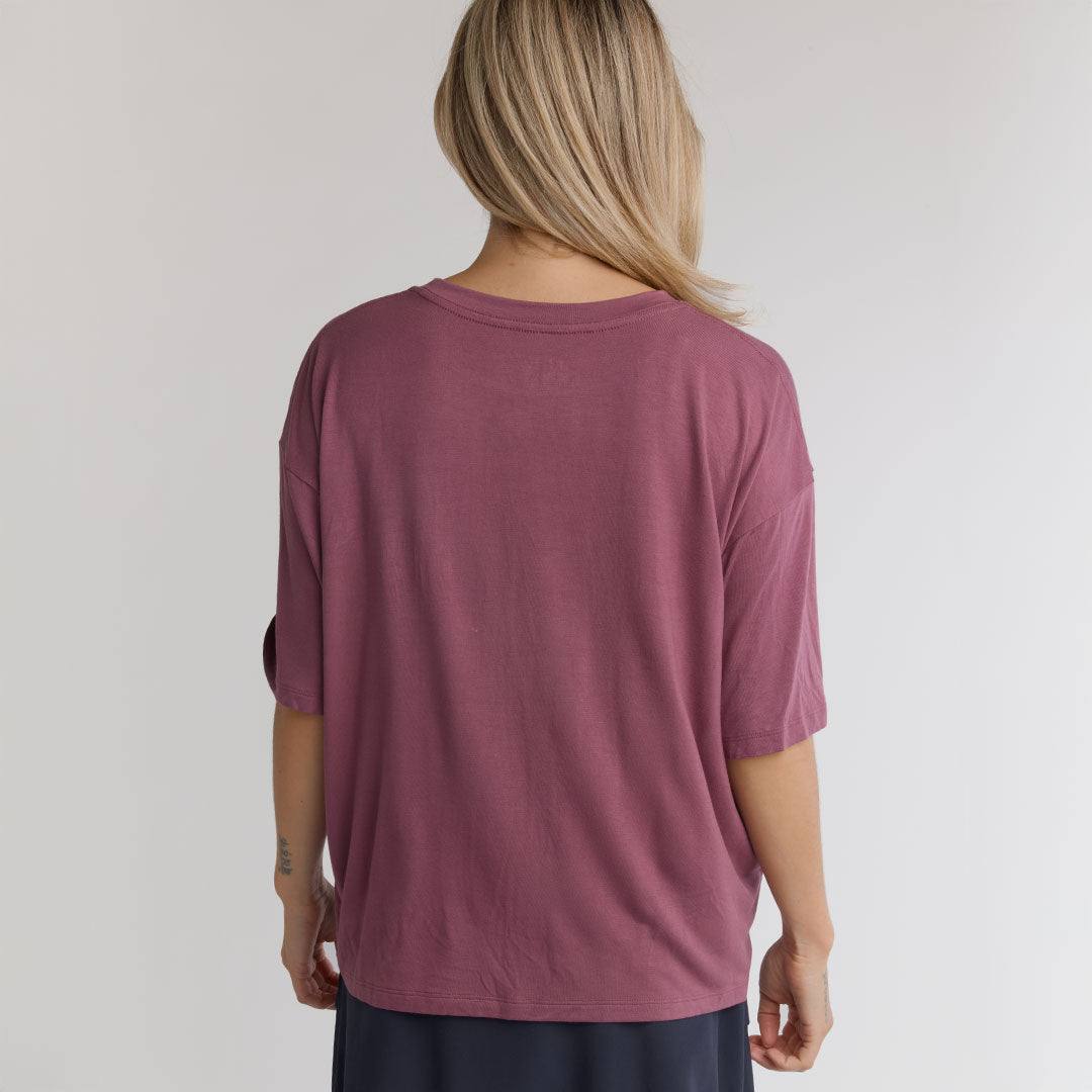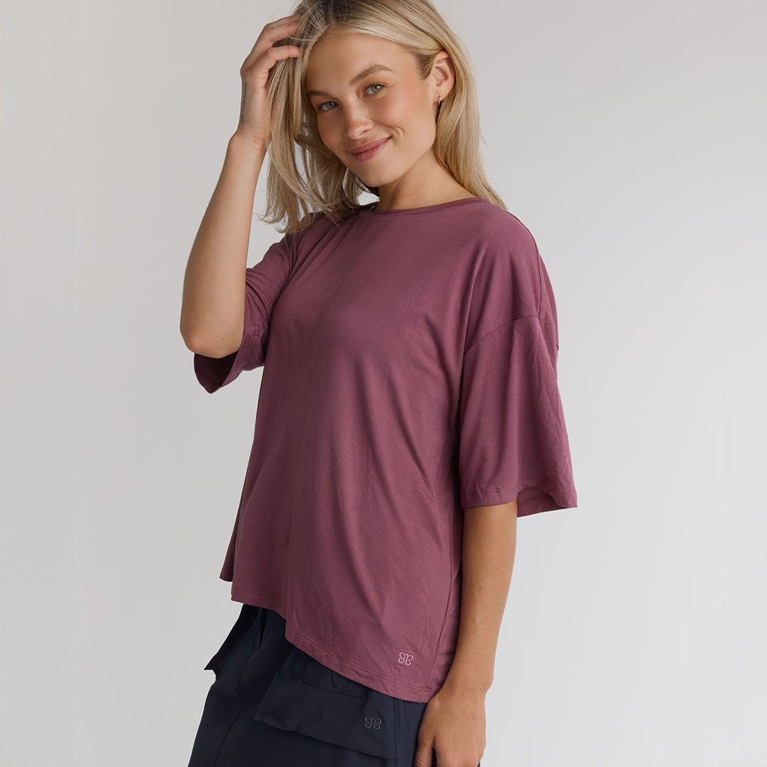 This tee is silky, soft, stretchy, and perfectly oversized. I am 5'6, 135 lbs, and got a size small. I have a long torso and the length was great with high waisted pants. A great closet staple!