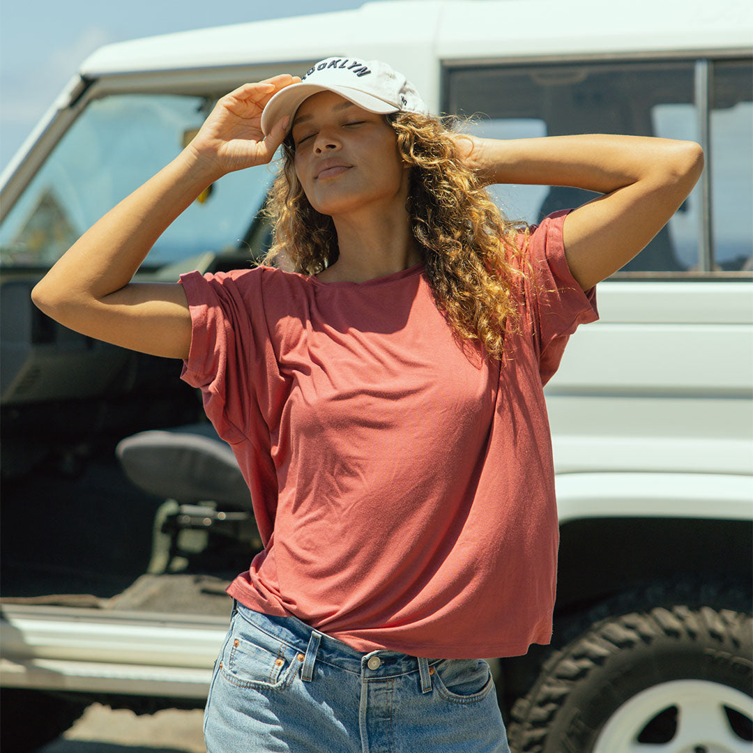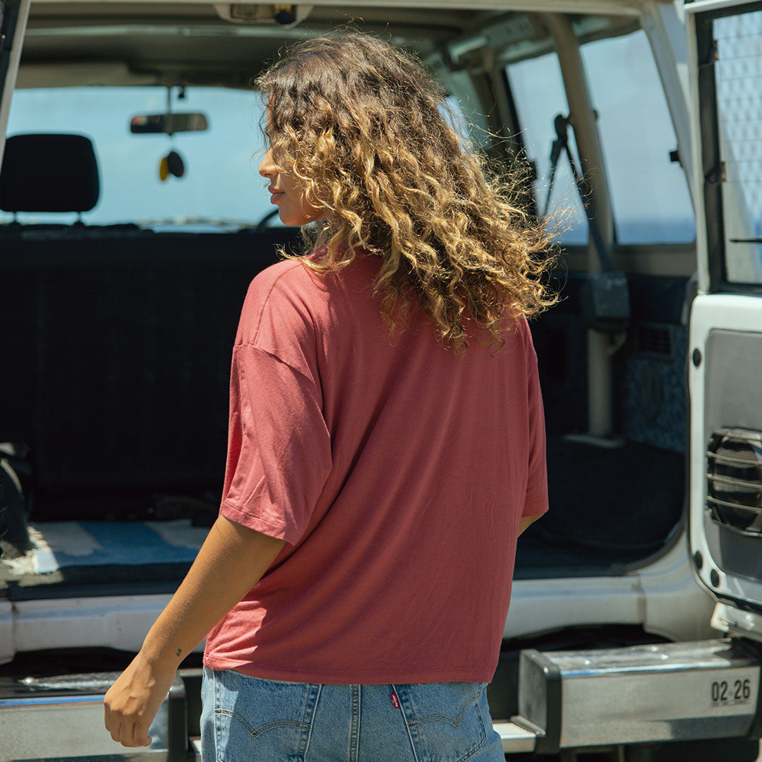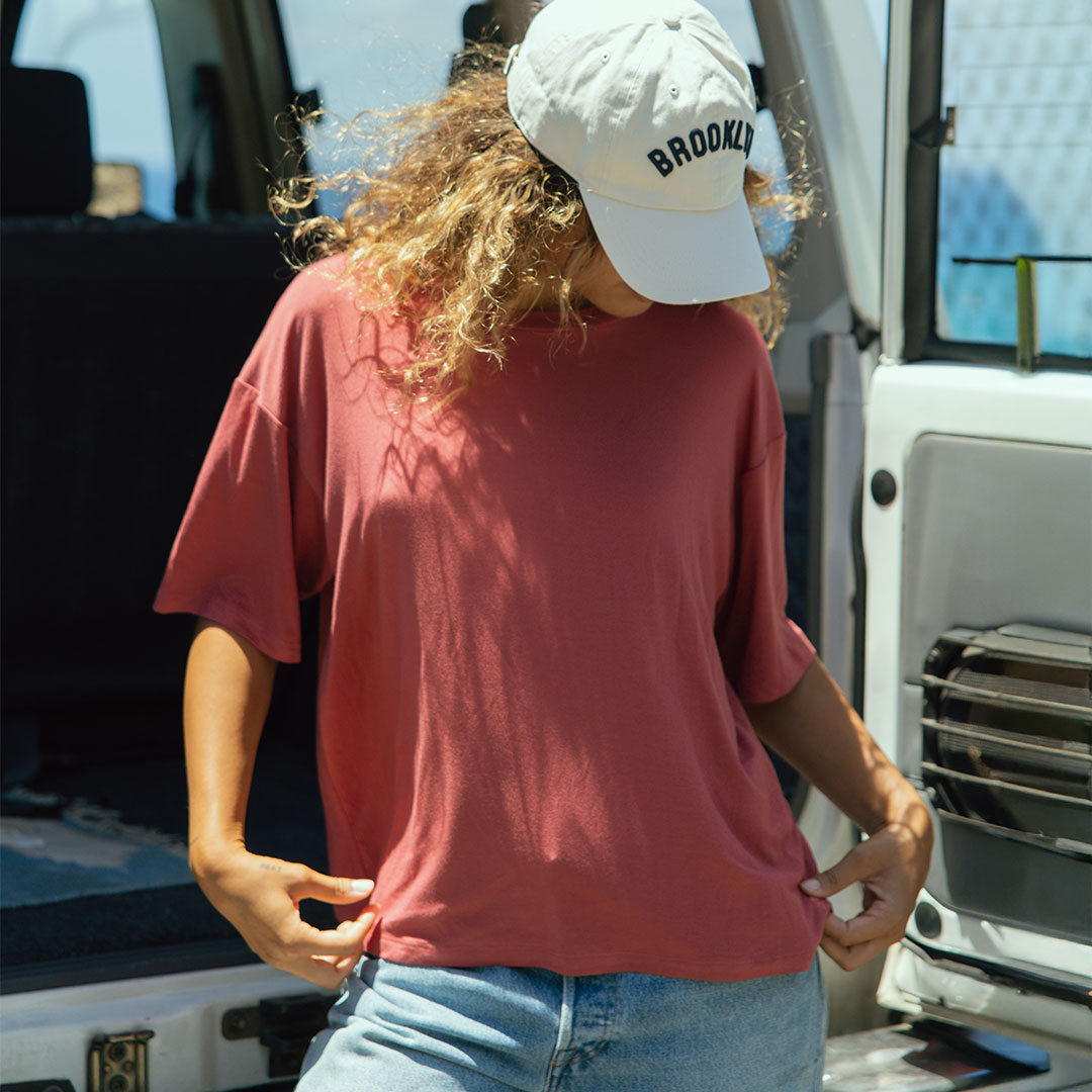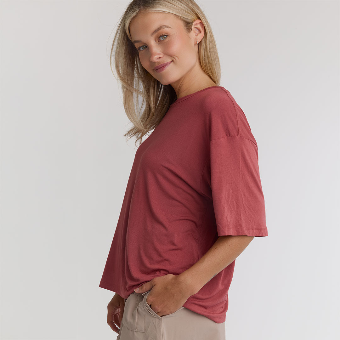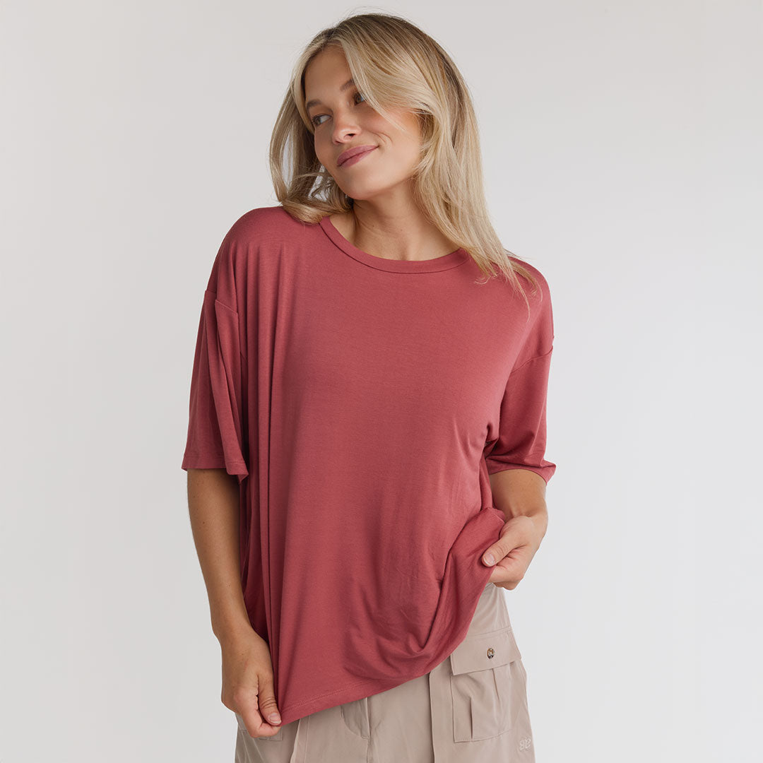 This tee is silky, soft, stretchy, and perfectly oversized. I am 5'6, 135 lbs, and got a size small. I have a long torso and the length was great with high waisted pants. A great closet staple!