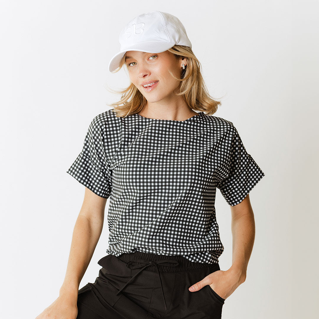 It fits well and even when I move around, the tee still keeps me modest. The neck line is just the perfect length. I love that they don't wrinkle and and have already bought 4 in different colors!