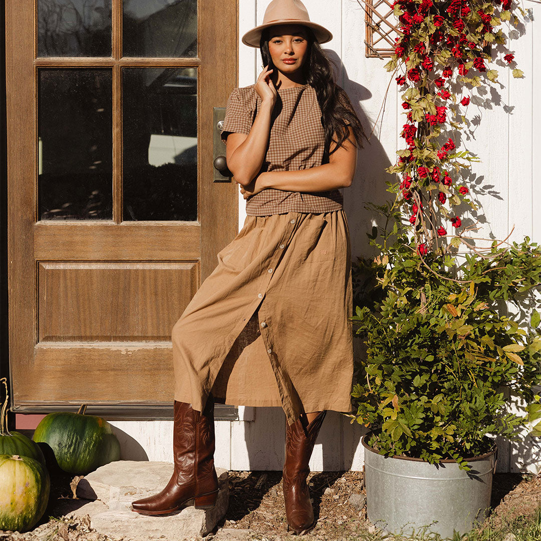 Flattering cut. TTS. Doesn’t wrinkle. Washes well. I have an hourglass shape and I can see how this would be a bit snug on the hip for some.