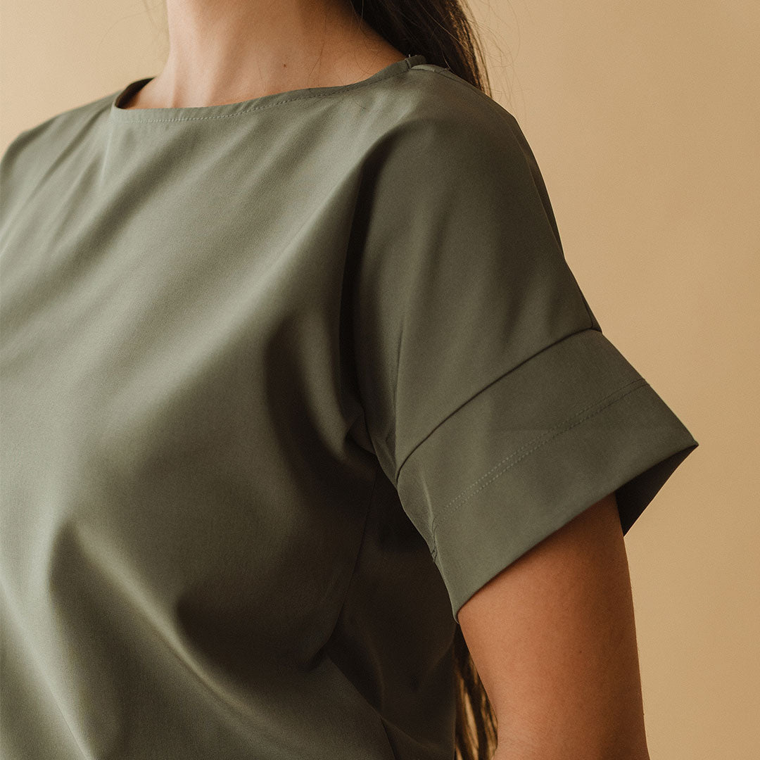 Flattering cut. TTS. Doesn’t wrinkle. Washes well. I have an hourglass shape and I can see how this would be a bit snug on the hip for some.