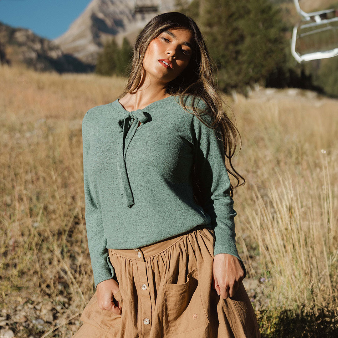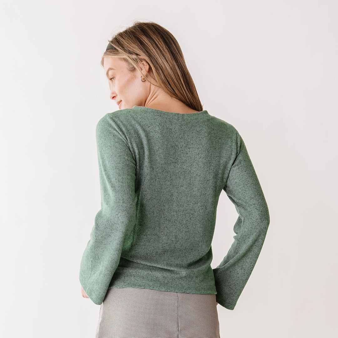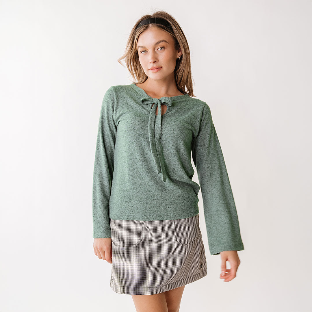 This sweater is so comfortable and the bow adds a cute feminine detail that helps feel a little extra put together. The bell sleeves aren’t too wide, but I will say both the sleeves and body of the sweater run a bit short (only reason for 4 instead of 5 stars). I’m typically between a size small and medium and was glad I sized up to medium for a tad more length.