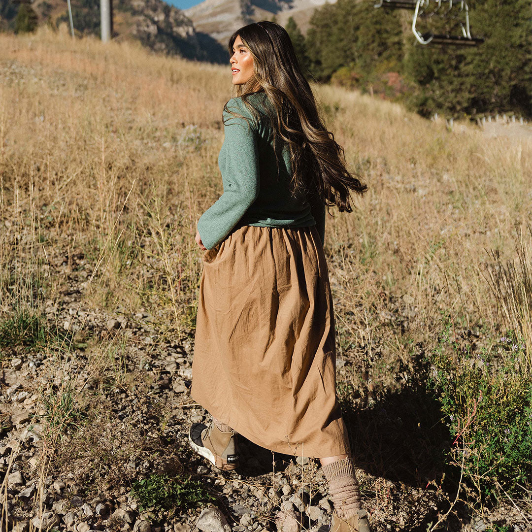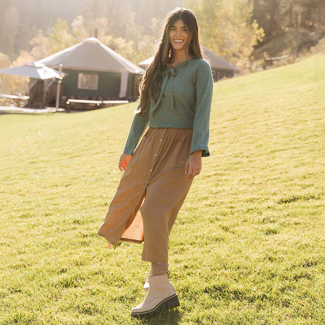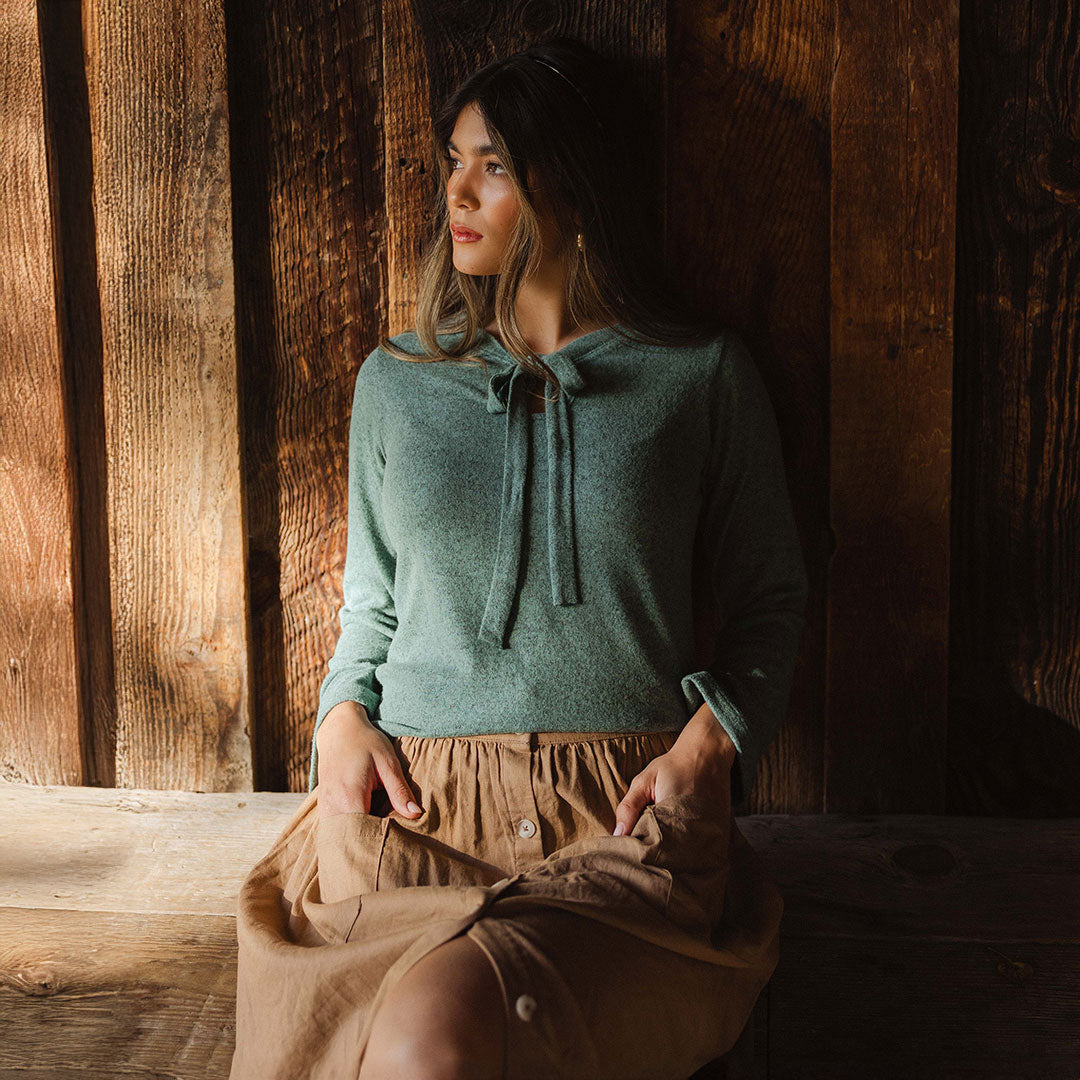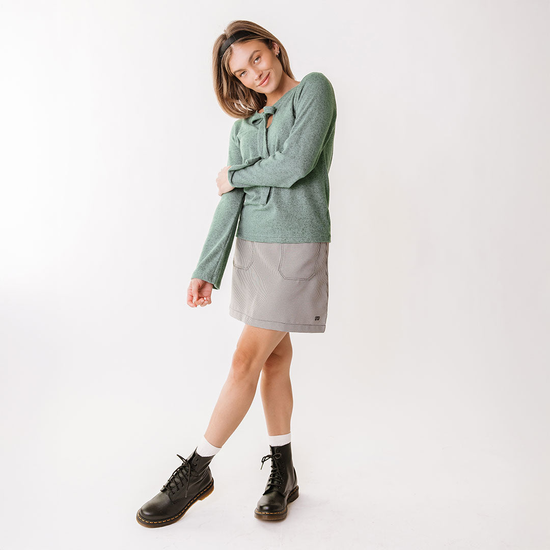 This sweater is so comfortable and the bow adds a cute feminine detail that helps feel a little extra put together. The bell sleeves aren’t too wide, but I will say both the sleeves and body of the sweater run a bit short (only reason for 4 instead of 5 stars). I’m typically between a size small and medium and was glad I sized up to medium for a tad more length.