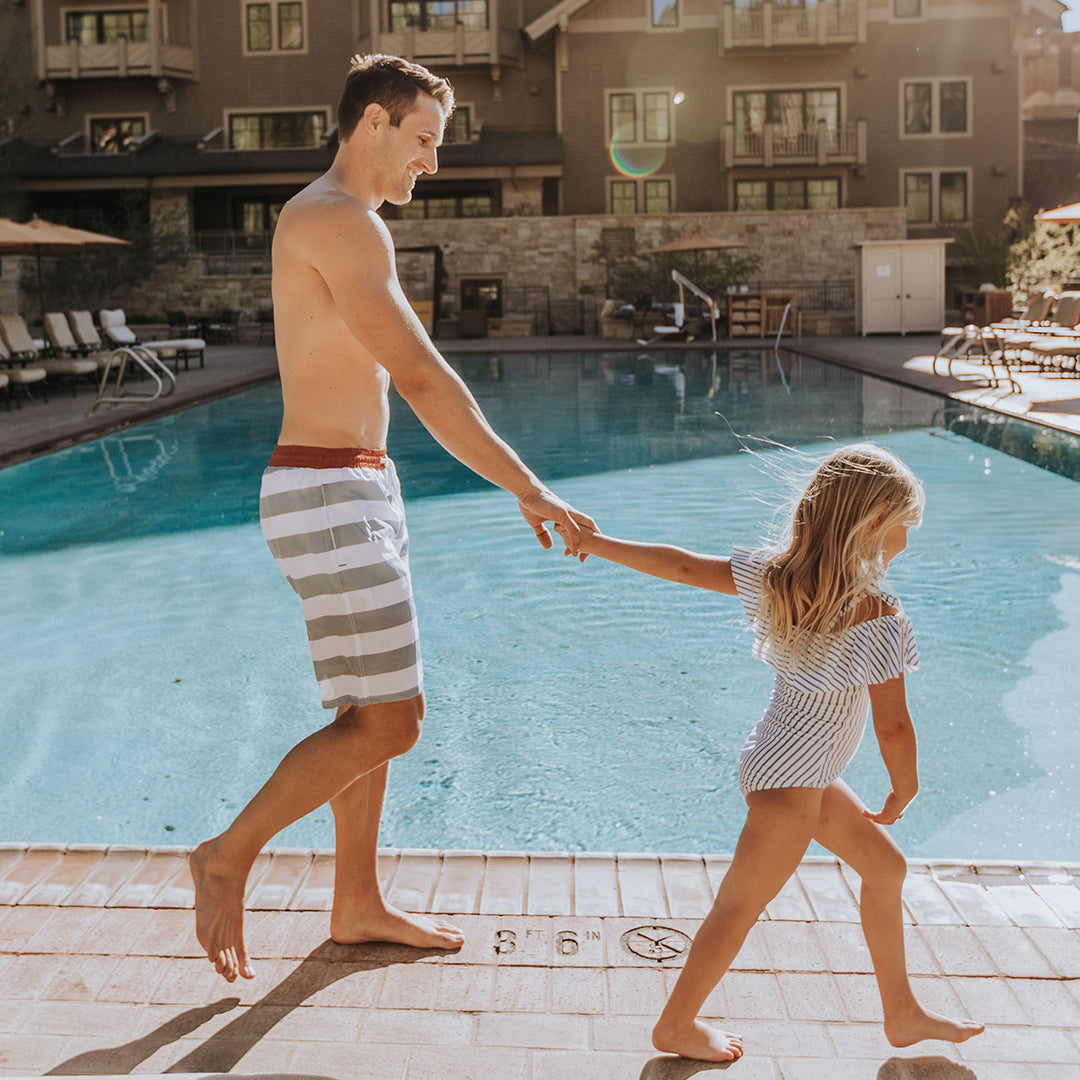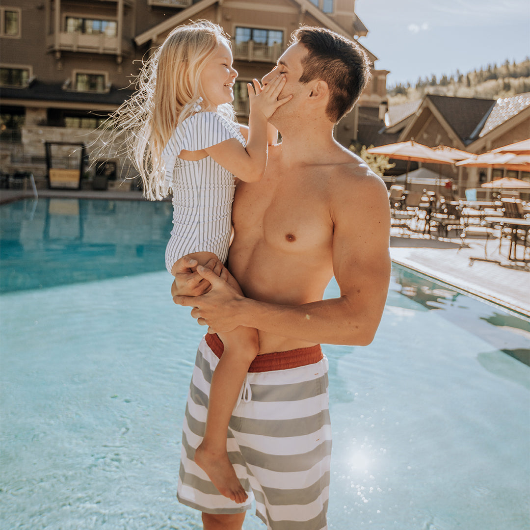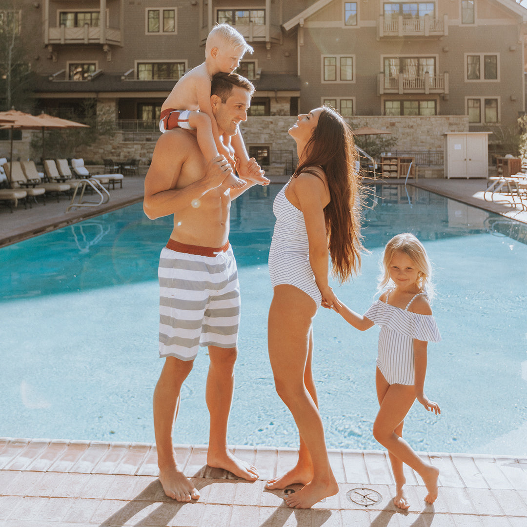 The Cruise Jr. Swim Trunks, The North Shore One-Piece Swimsuit, and the Mini Wave One-Piece, Breezy Stripe make for the perfect match for the whole family!
