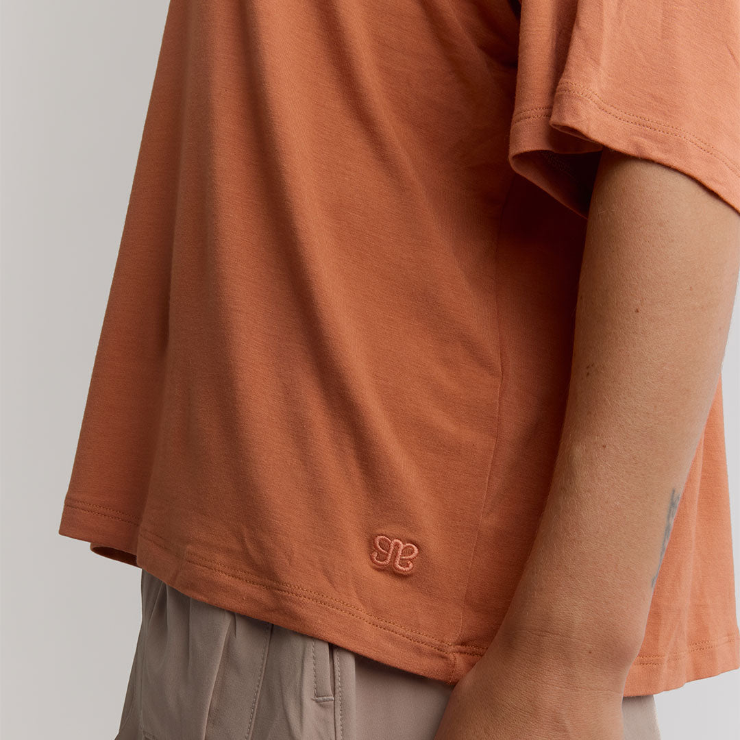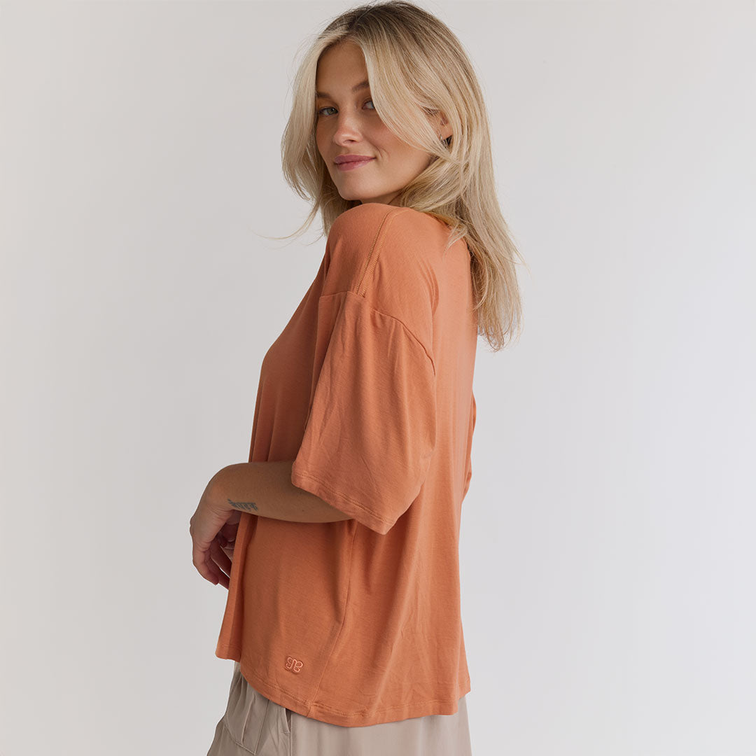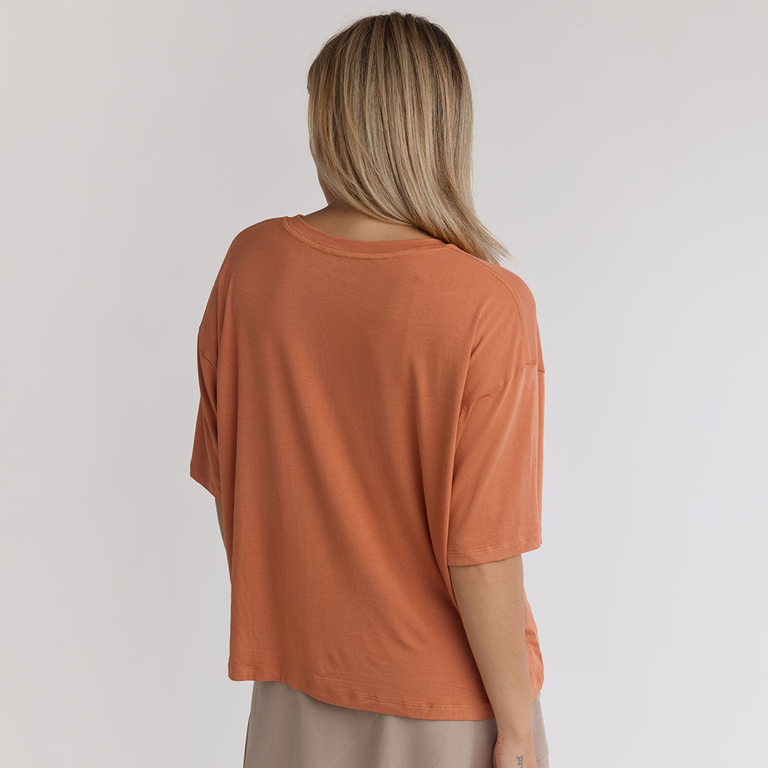 This tee is silky, soft, stretchy, and perfectly oversized. I am 5'6, 135 lbs, and got a size small. I have a long torso and the length was great with high waisted pants. A great closet staple!