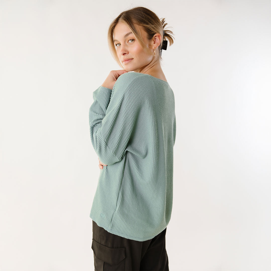 This is a really pretty top. The material is soft and lightweight, with a beautiful textured design. It fits oversized and flows nicely. I am 5'6", 135 lbs and my usual small fit great. The spa blue color is very pretty.