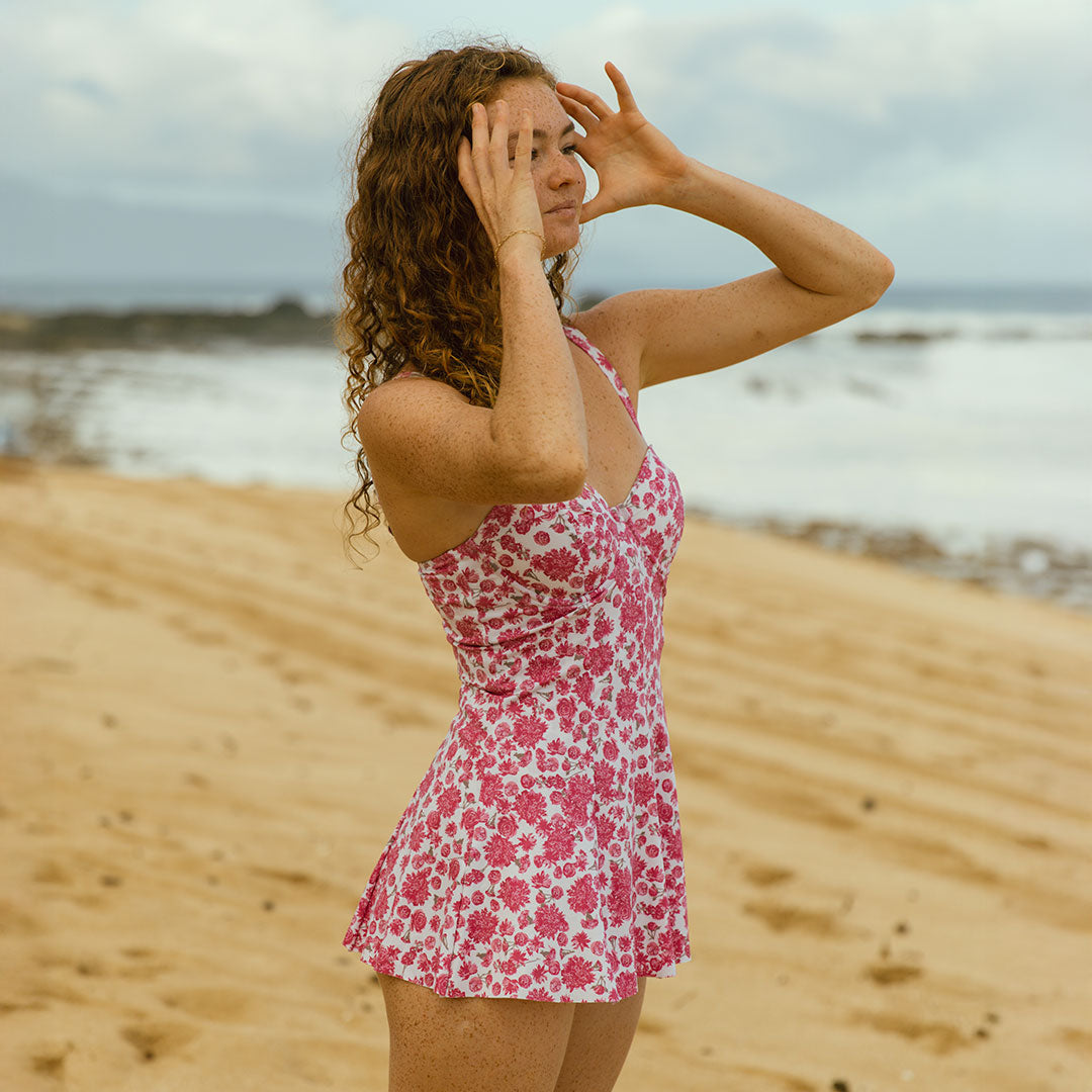 Love the print and fit! Somehow this suit manages to provide coverage but is fun and flirty! The bottom fits a little strange on me - doesn’t quite cover my derrière but is almost too big - however the skirt covers it so it doesn’t matter. I’m large busted and the support is great. I tried the one piece version and that one was too small in the bust. Overall love it!