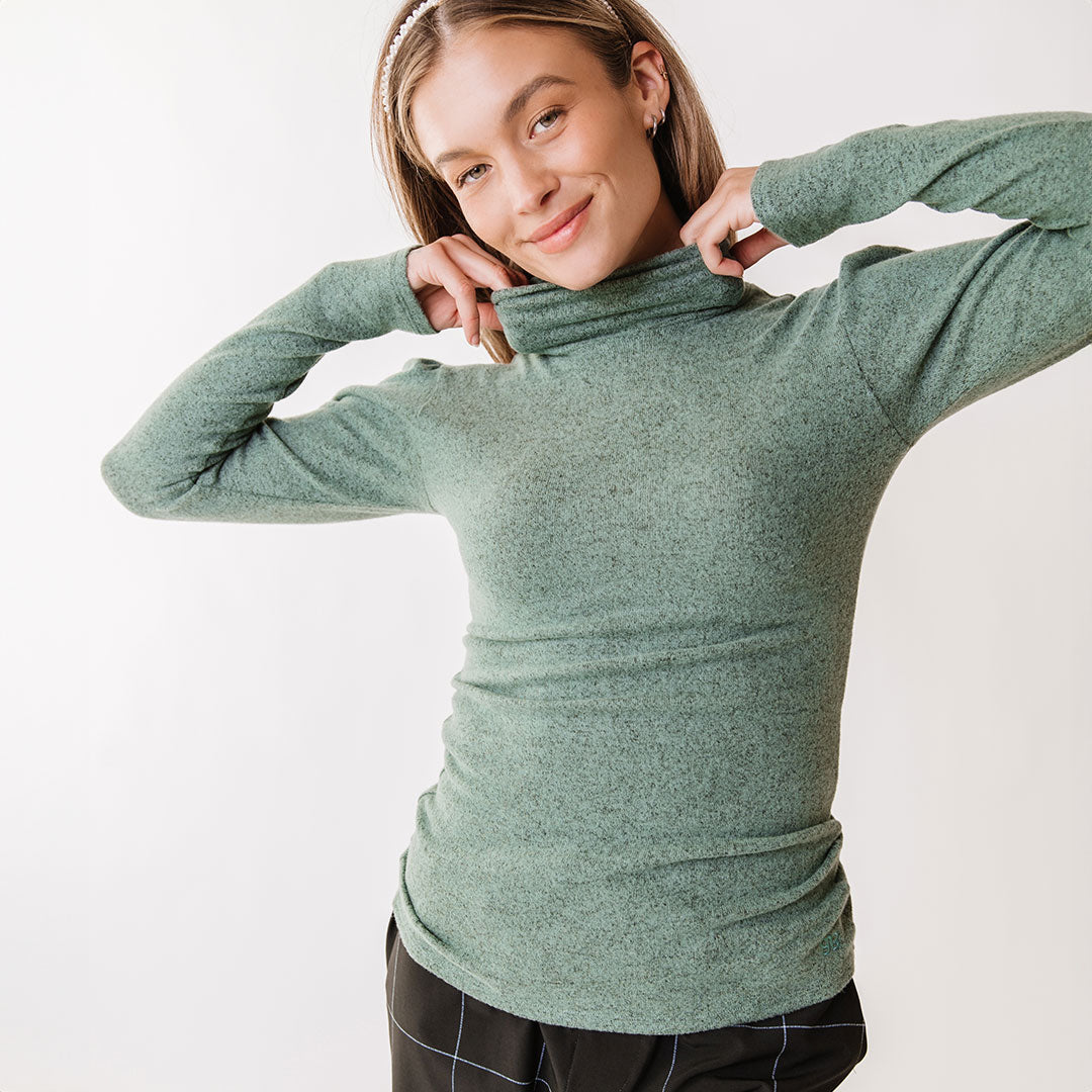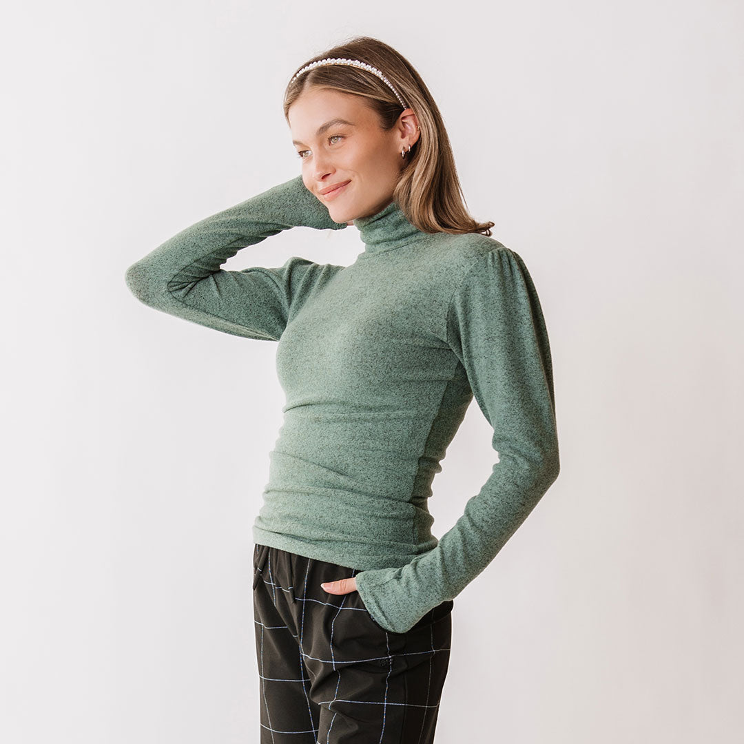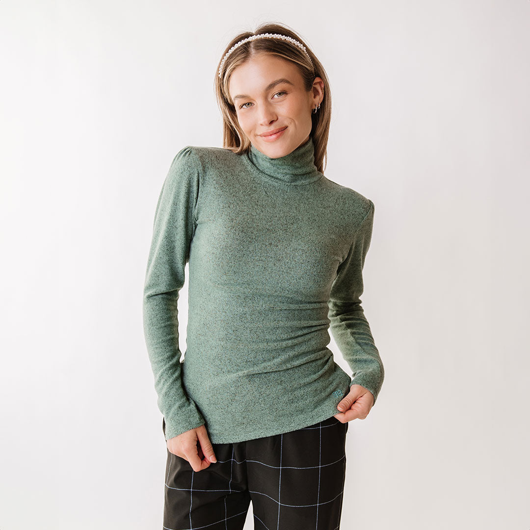 I love the small detailing in the shoulders and subtle turtle neck. Great office piece.