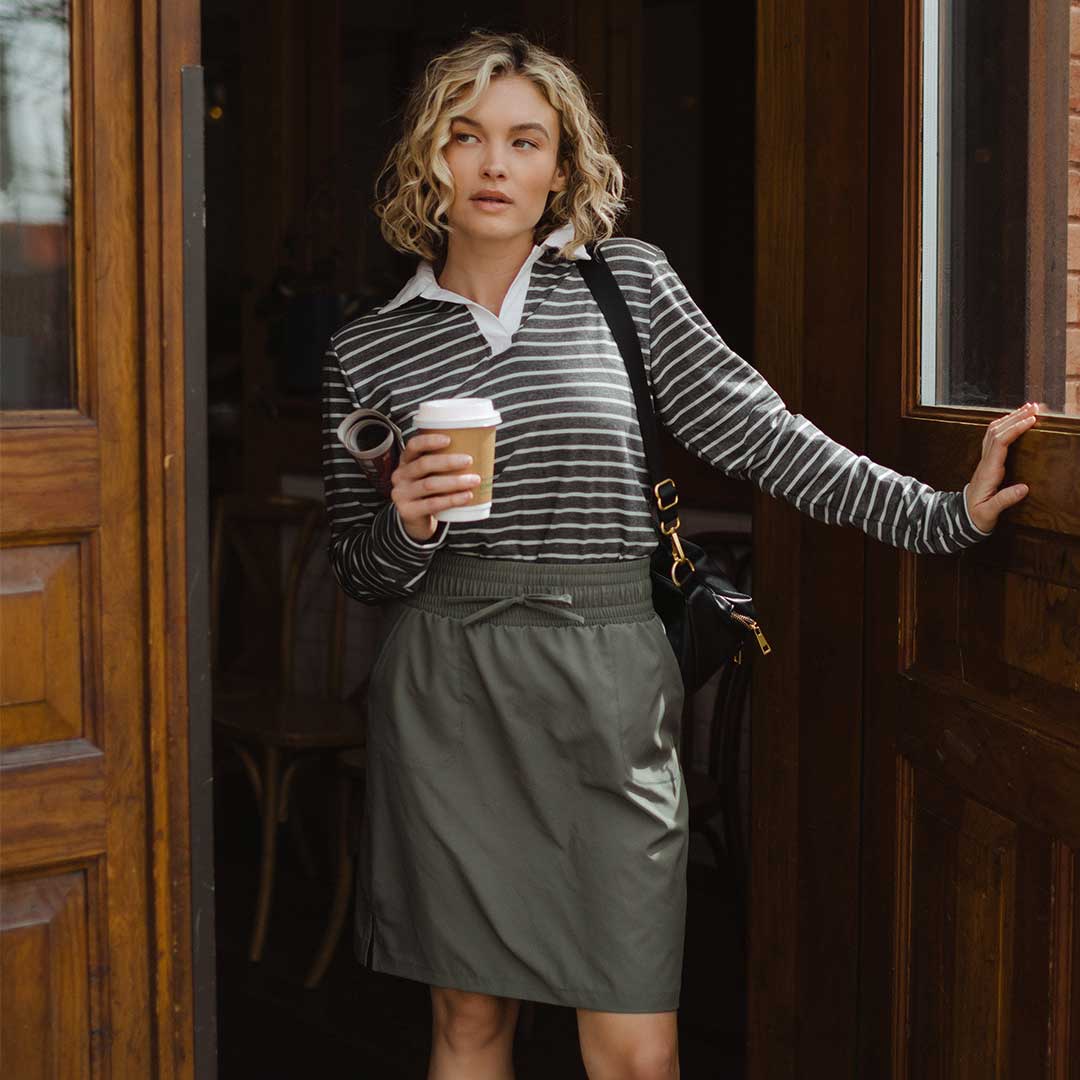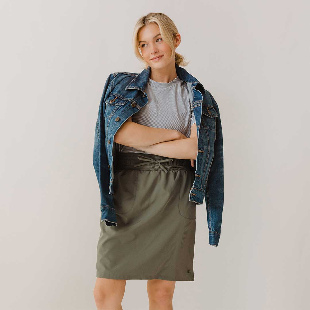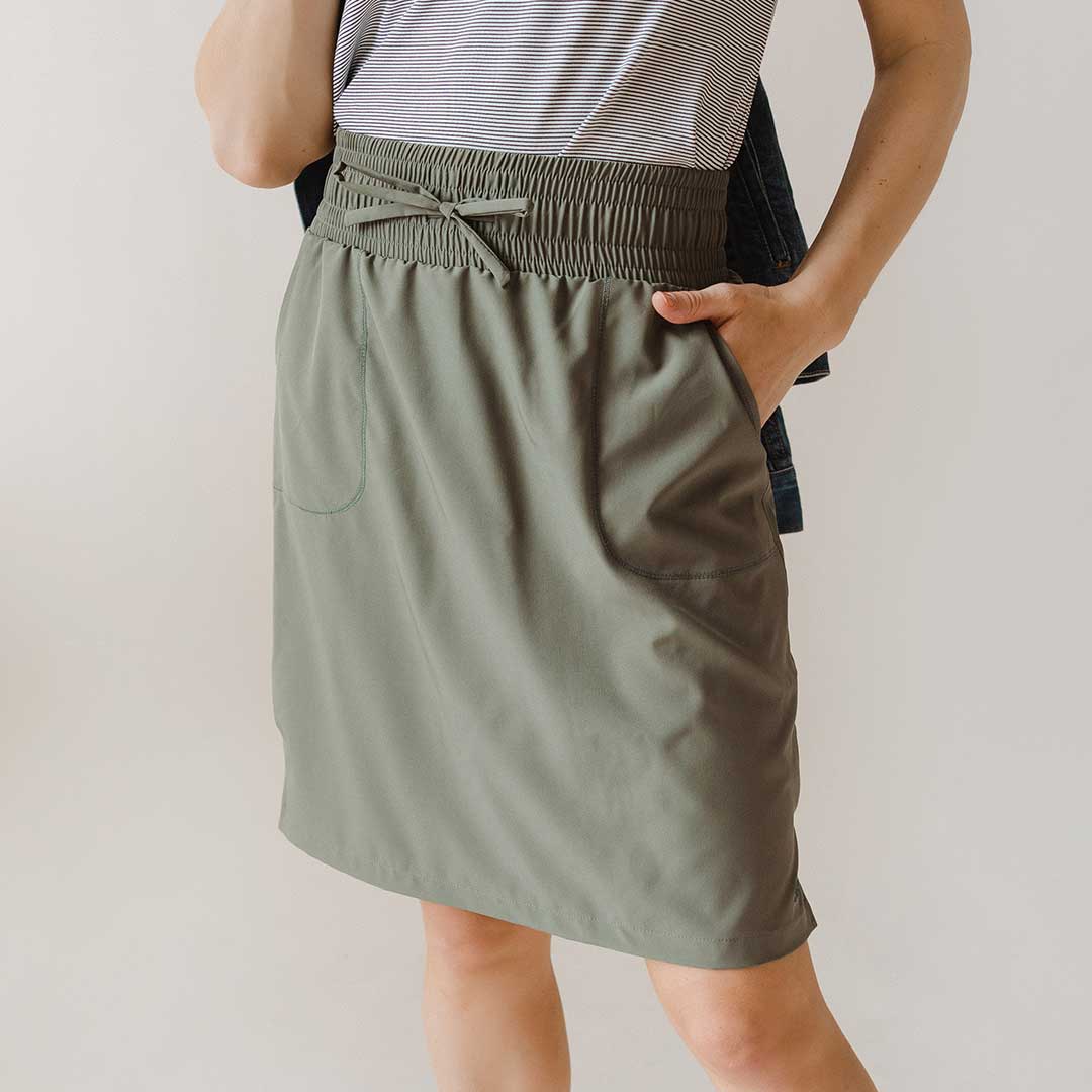 This is my second skirt I have bought in this style, but in a different color! This skirt is THE BEST for traveling. I know from my other color, it washes up well and dries quickly! I’ve even washed it in the sink and hung it up over night to dry. My only hang up is that I don’t love the thick waistband. I wish it were the 1” waistband. I ordered the Large Tall and it went to my knee! PERFECTION! I am 6’ tall and I weigh 155# for reference.