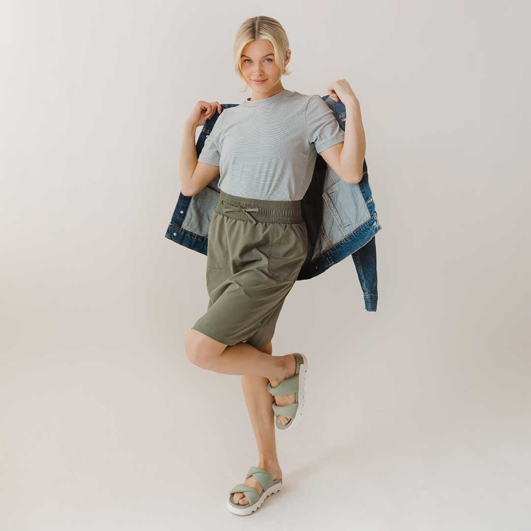 Super cute, easy fabric (no wrinkle, quick dry), love the thick waist band. Great length. Love!